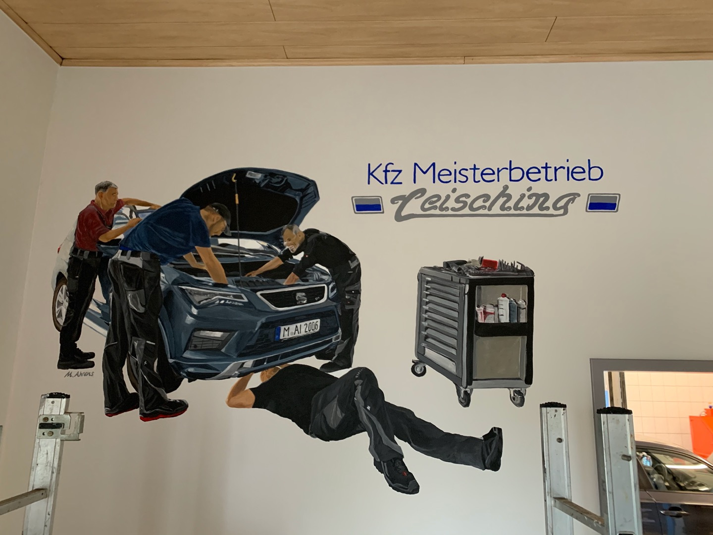 Die weiße Wand im Büro der Schwarzenbacher Autowerkstatt Leisching ist durch das Wandgemälde nun ein echter Blickfang für Kunden und Personal.