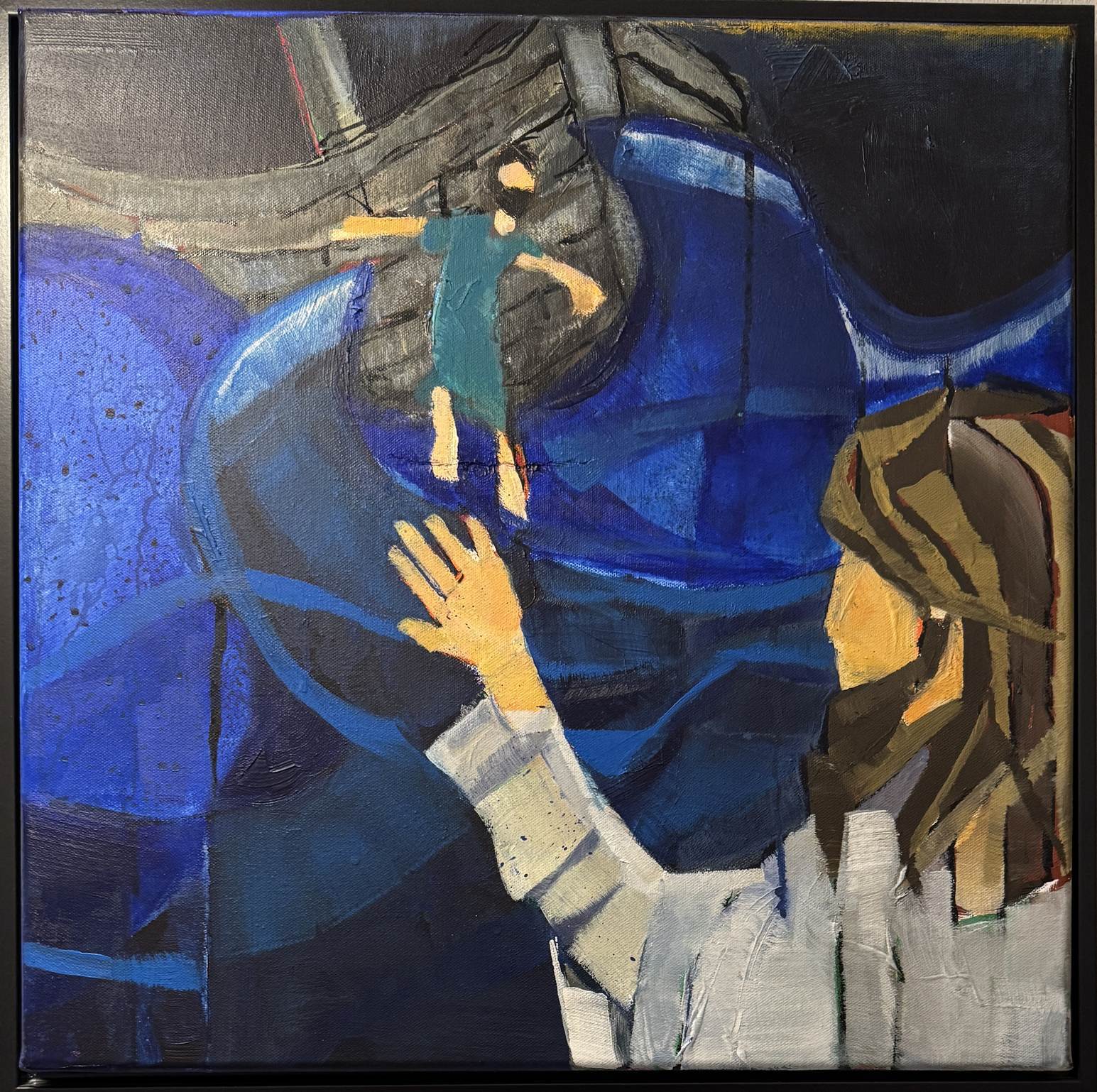 In Blau sehen wir Petrus, der sich - mit Jesus im Blick - aufs stürmische Wasser wagt (Matthäusevangelium, Kapitel 14).